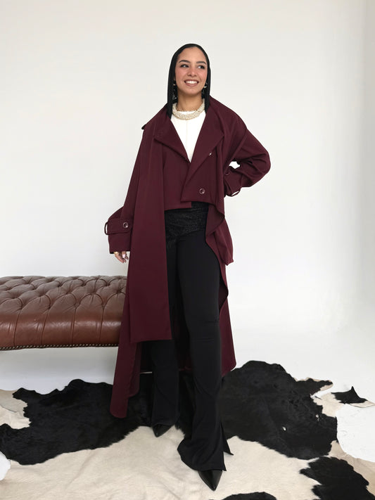 Asymmetric trench coat in Burgundy