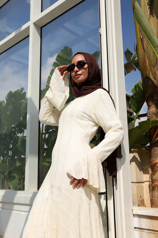 lace dress with a unique design in brown , fully lined." فستان من الدانتيل الفاخرباللون الكريم، يجسد براعة التصميم بتفاصيل فريدة وبطانة كامله ناعمة تمنحكِ رقياً لا يضاهى."