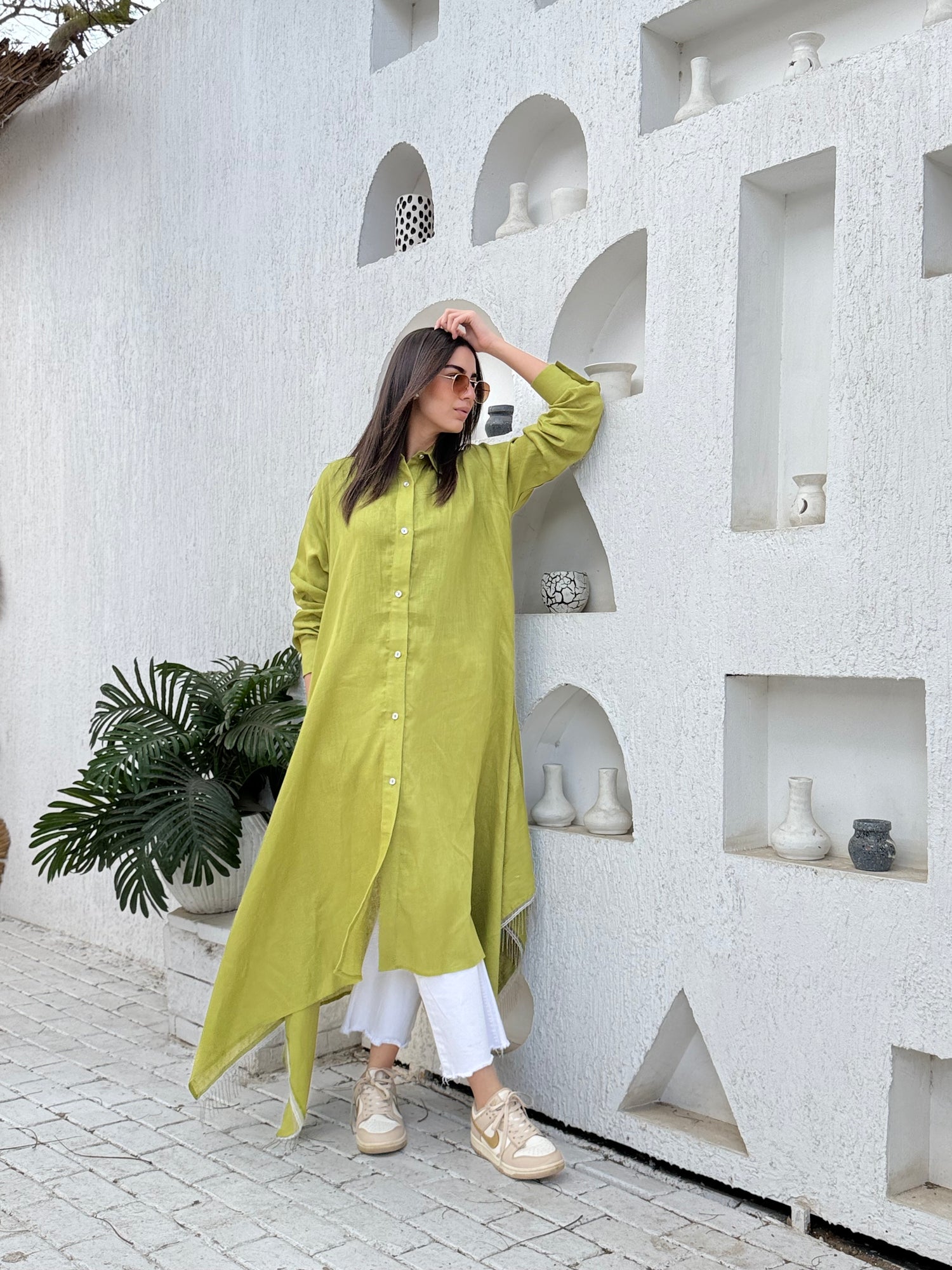 Wrap striped linen in beige فستان كتان مخطط بلون البيج بنمط اللف