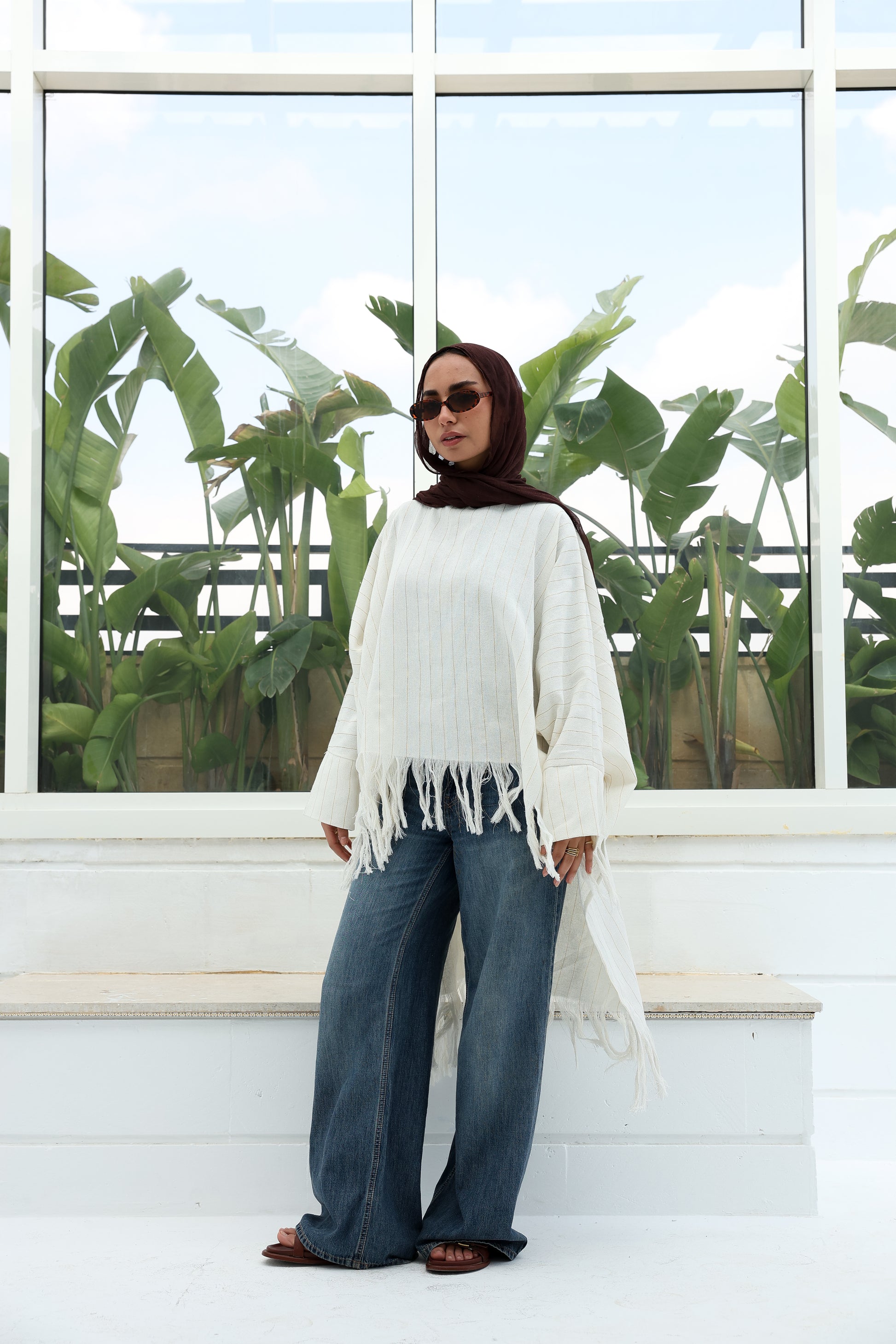 Boho stripped with golden lines high and low linen blouse ;بلوزة كتان بستايل بوهيمي، مخططة بالخطوط الدهبي، بقصة (هاي-لو) قصيرة من الأمام وطويلة من الخلف."