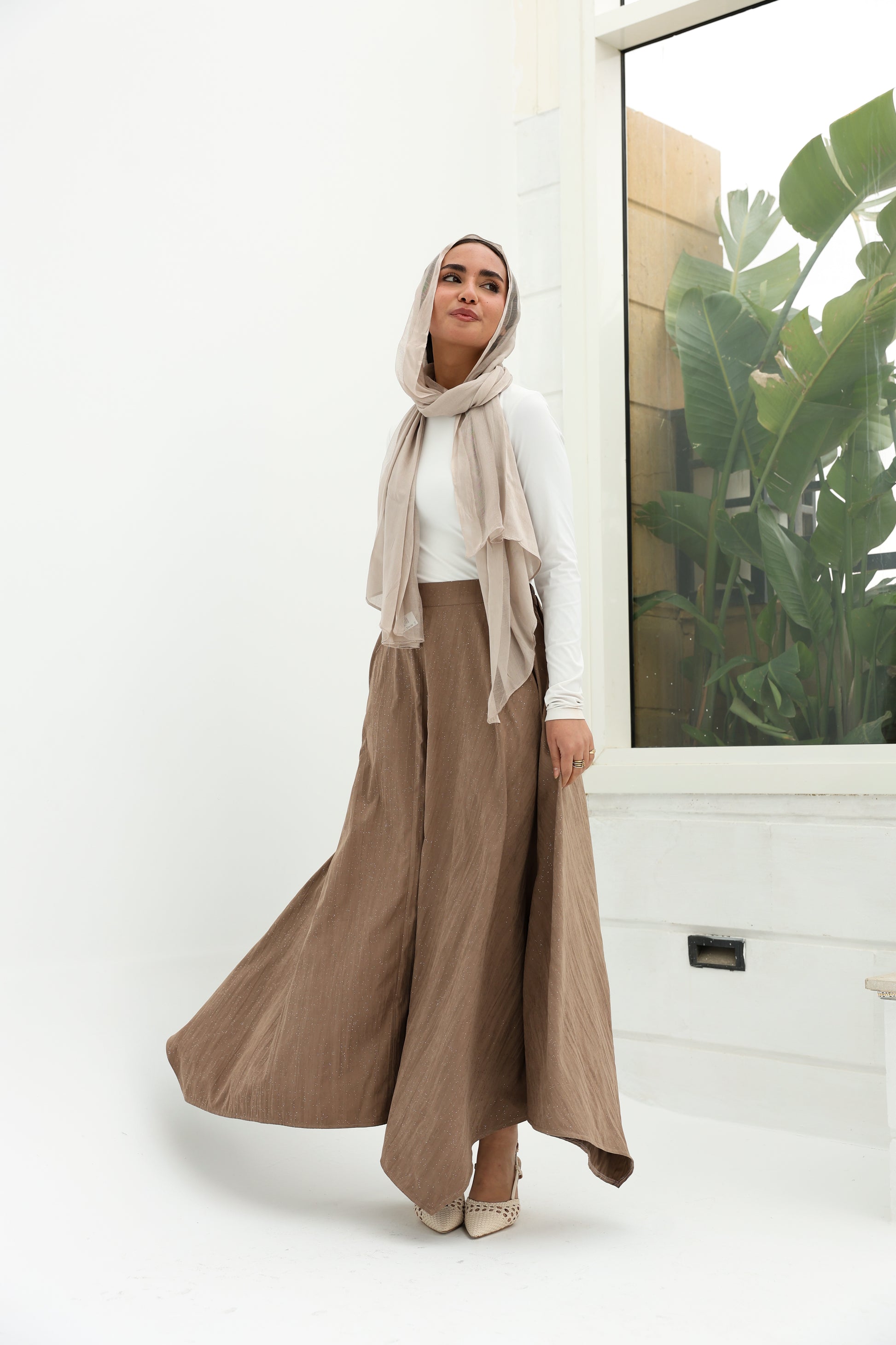 Crushed skirt in shimmered mocha تنورة بكسرات بلون الموكا بلمعة خفيفه
