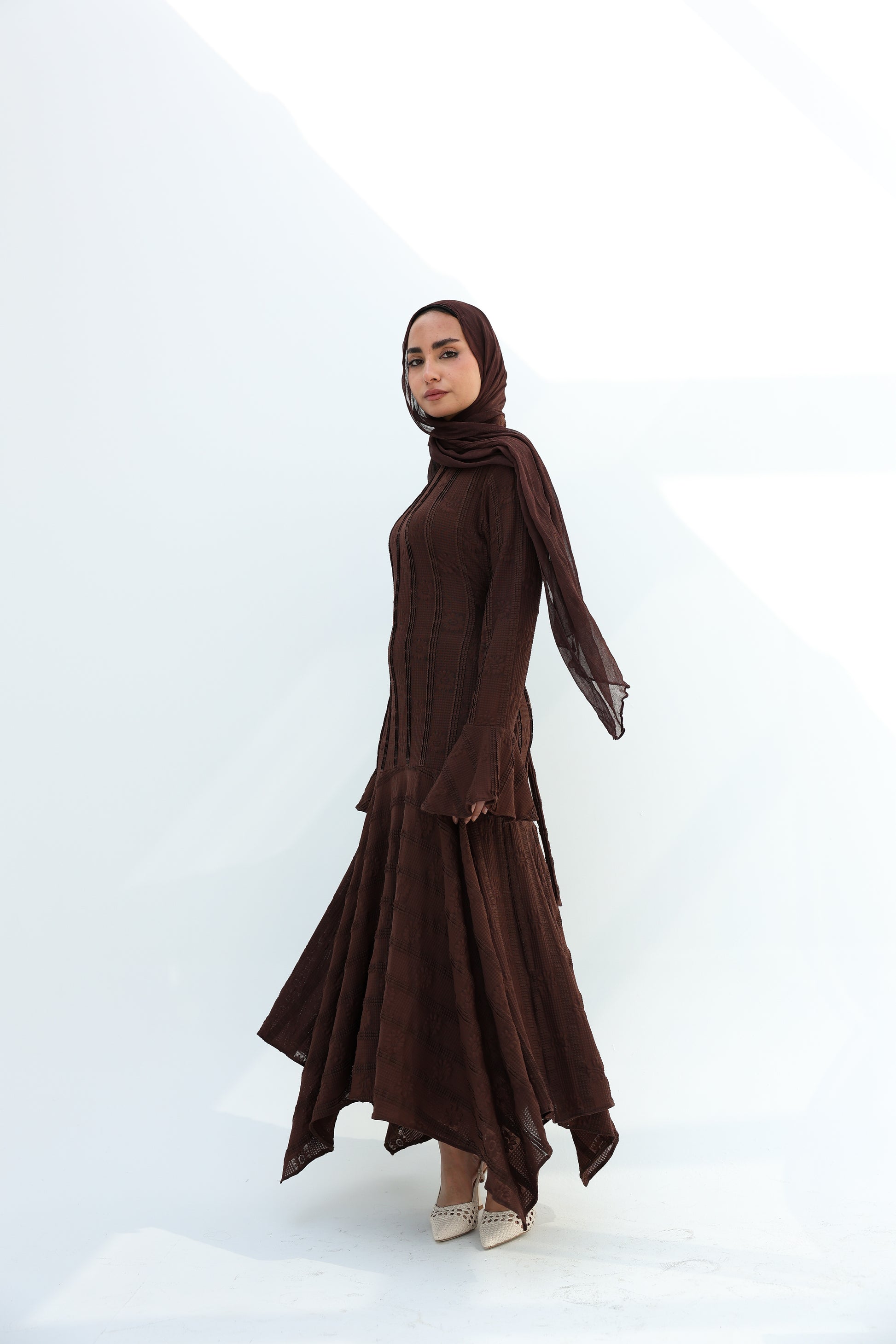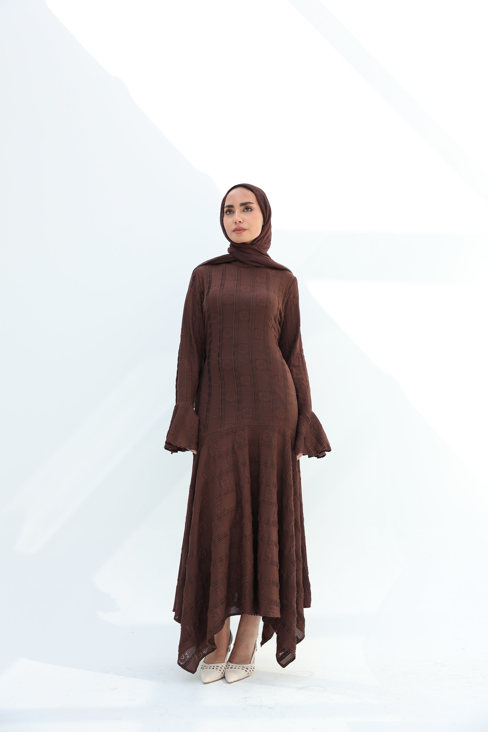 lace dress with a unique design in brown , fully lined." فستان من الدانتيل الفاخرباللون البني، يجسد براعة التصميم بتفاصيل فريدة وبطانة كامله ناعمة تمنحكِ رقياً لا يضاهى."