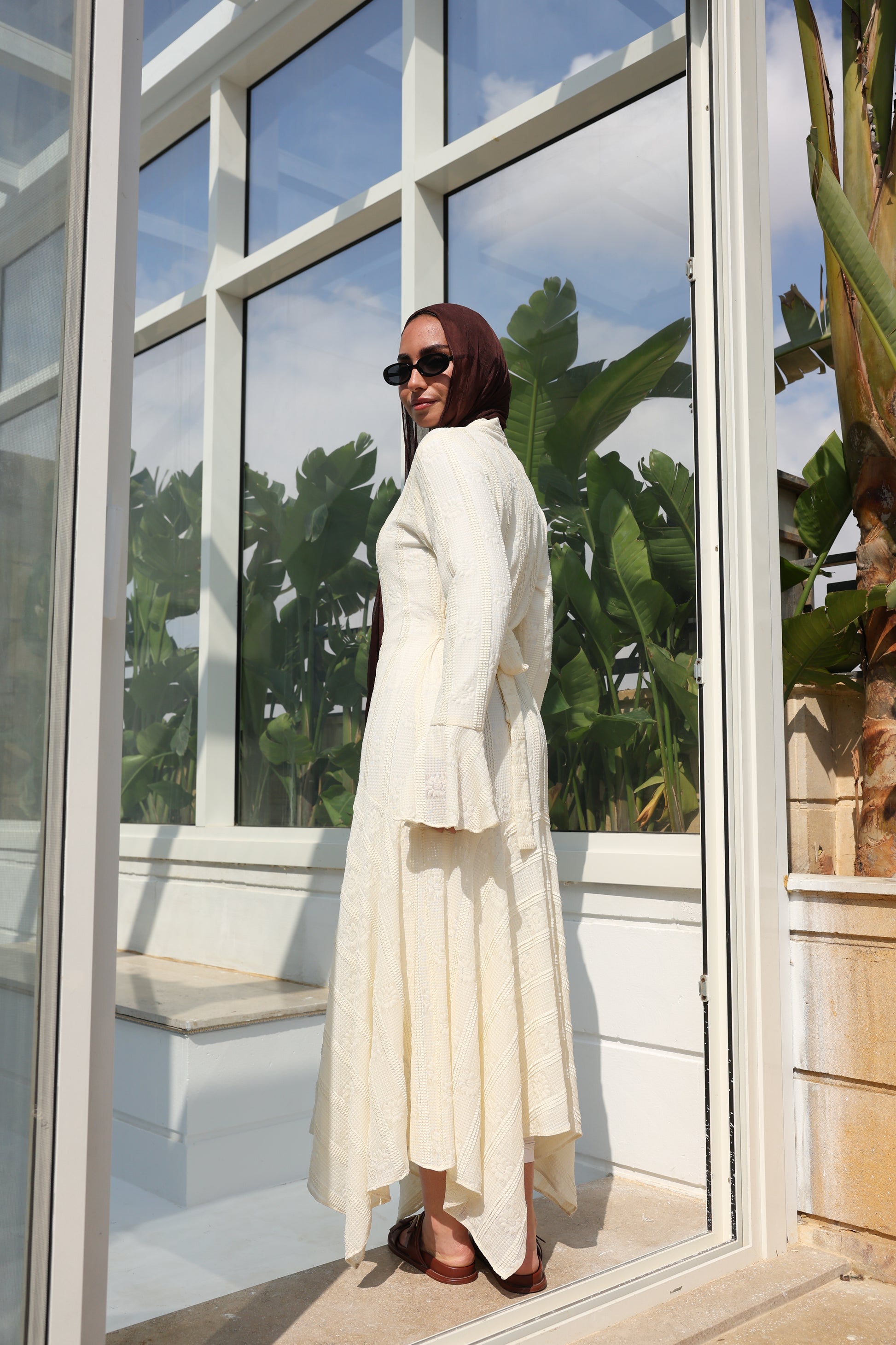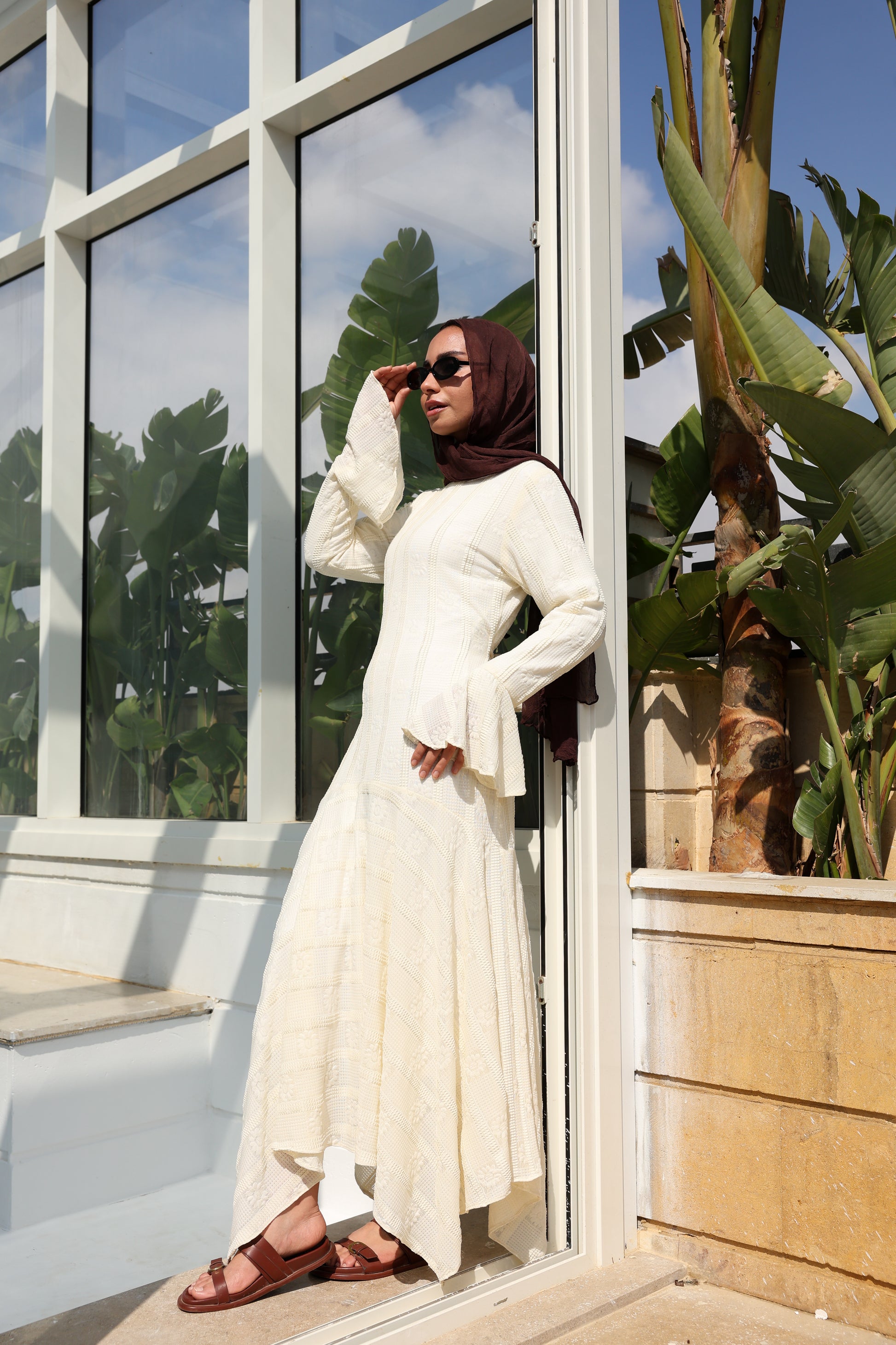 lace dress with a unique design in brown , fully lined." فستان من الدانتيل الفاخرباللون الكريم، يجسد براعة التصميم بتفاصيل فريدة وبطانة كامله ناعمة تمنحكِ رقياً لا يضاهى."